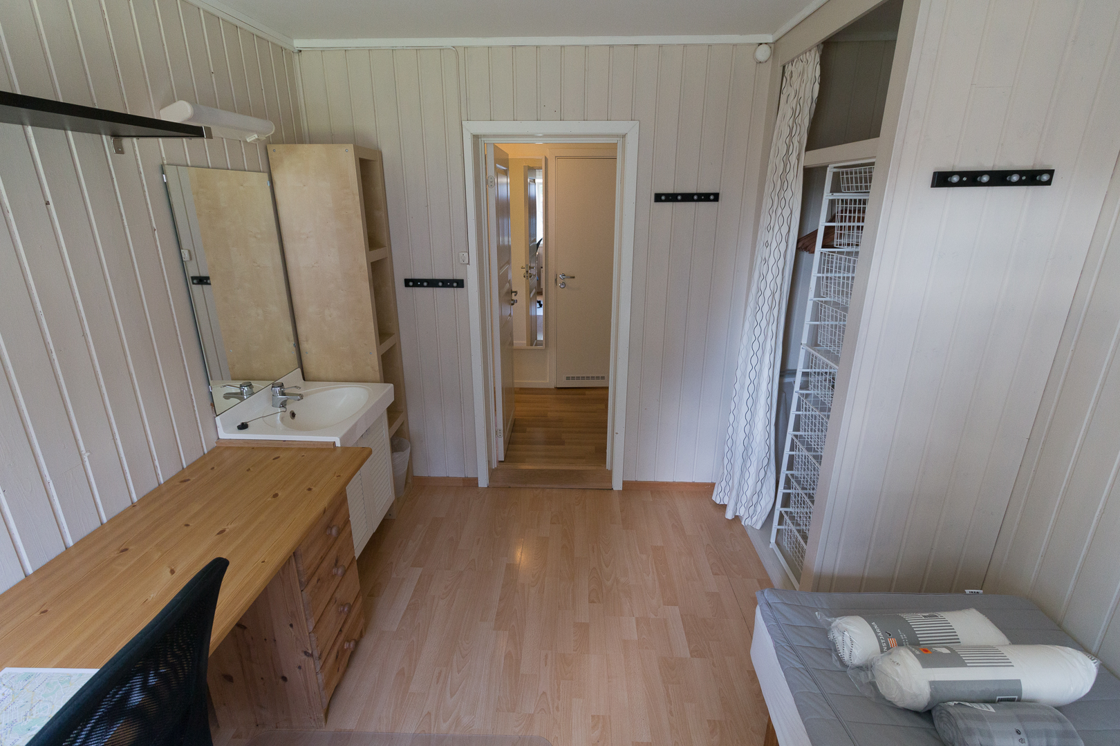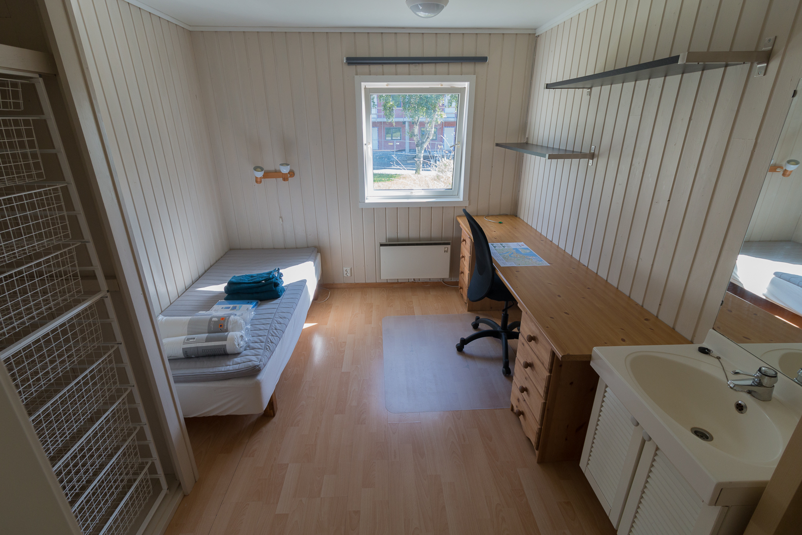 Hybelen har lysmalte vegger og inneholder arbeidsplass med kontorstol og hyller. Seng 90X200 med overmadrass. Garderobeskap samt bokhylle. Egen servant med skap og speil.