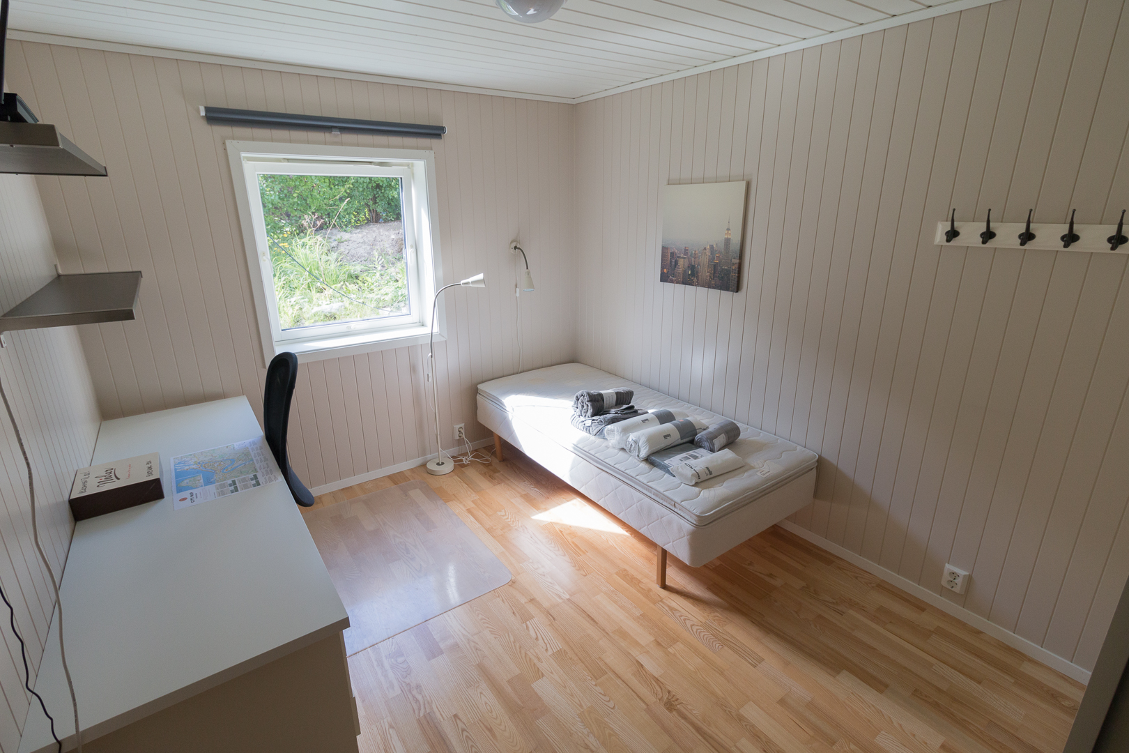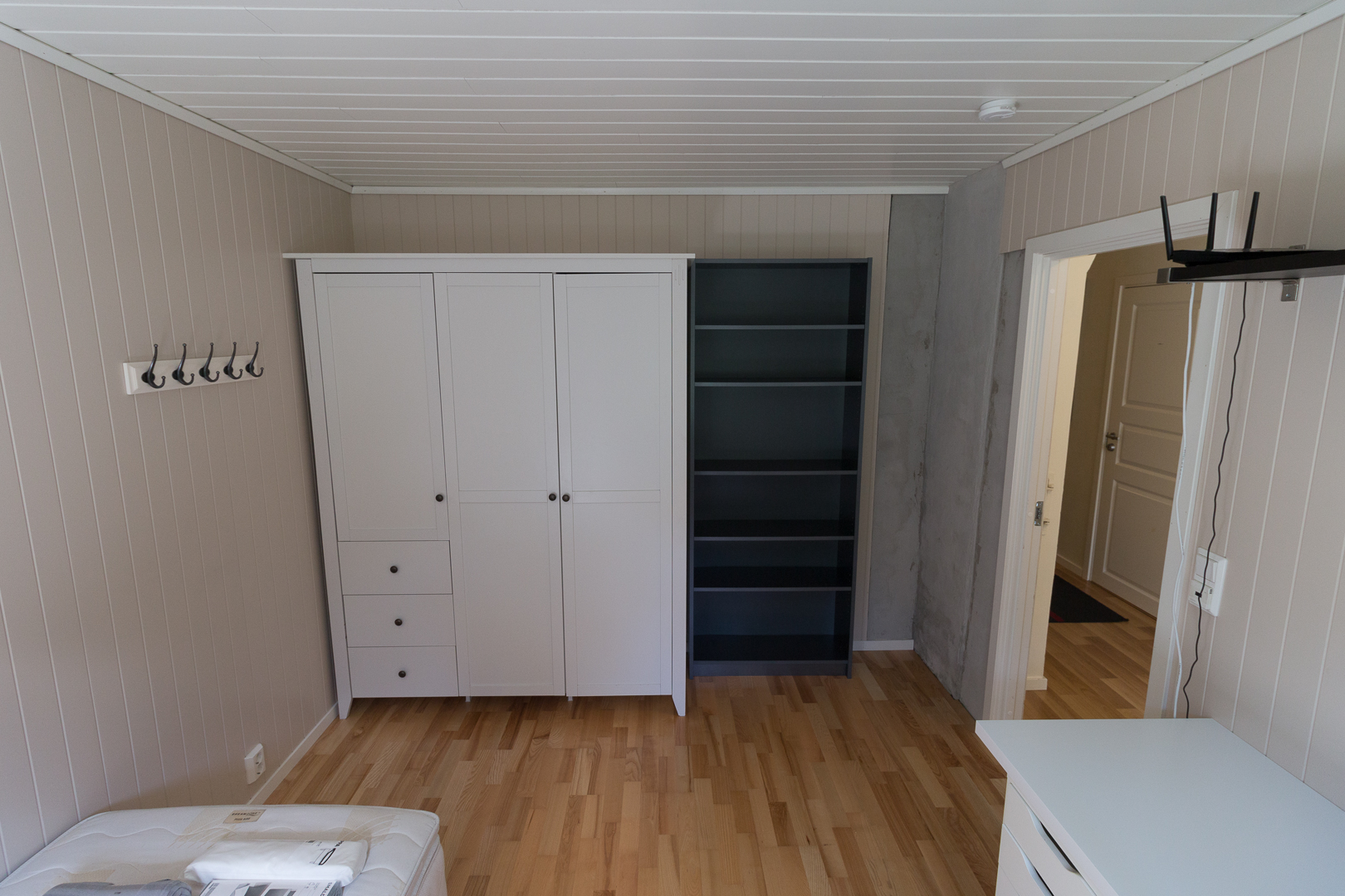 Hybelen er fullt møblert med seng, stor garderobe, bokhylle, skrivepult, og kontorstol. Parkett på gulvet med gulvvarme, lyse plater på vegger og i tak.